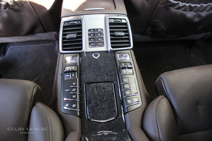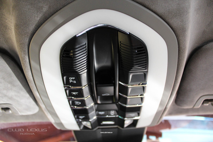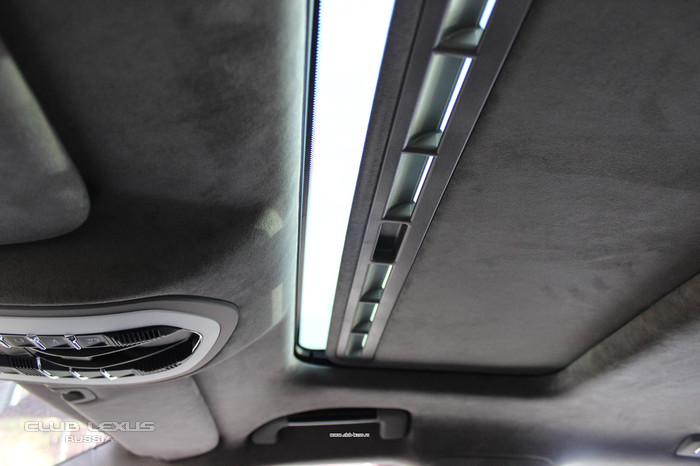 Центральная консоль, окаймляющая рукоятку АКПП напоминает гигантский Vertu. В замшевом потолке дизайном вторит панель управления люком и освещением салона.