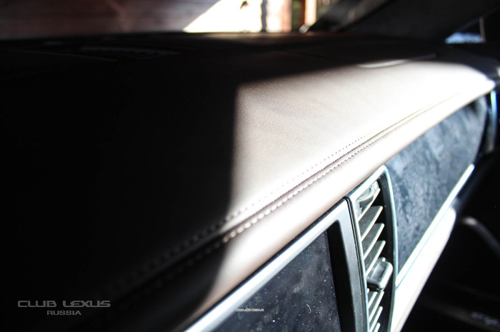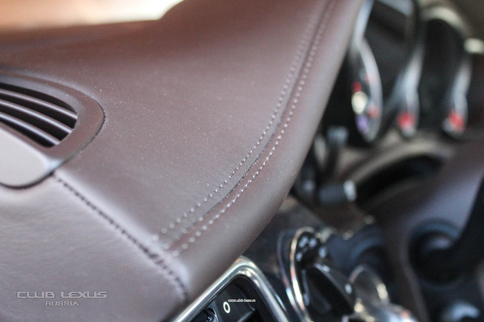 Добротная кожа с безупречной строчкой стелется по всей длине торпедо