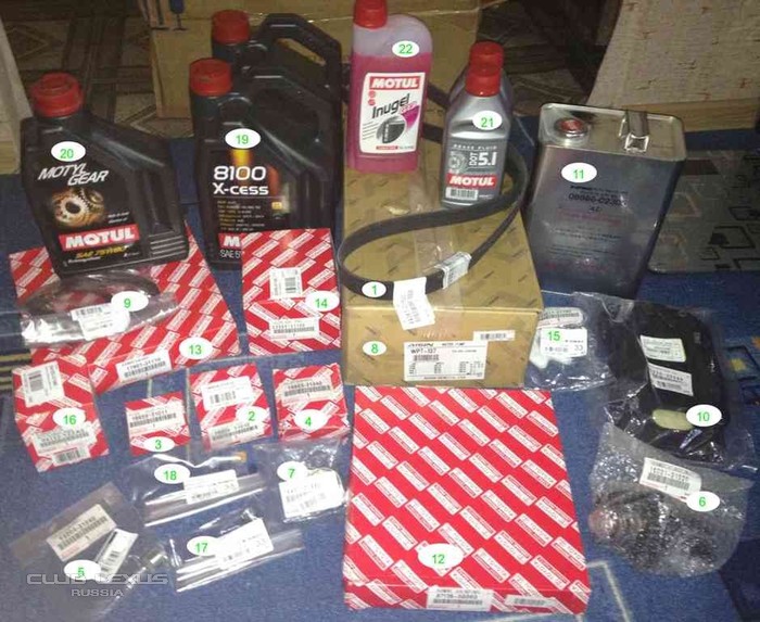 Данный дилерский GSE20 купил у первой и единственной знакомой хозяйки. С одной стороны это огромный плюс, т.к. машину знаю и в ней уверен. С другой стороны, она не помнит последние обслуживания и потеряла при переезде сервисную книжку, упомянула лишь замену трех стандартных фильтров и масла ДВС, в связи с чем, менять все равно приходится все полностью. Кроме антифриза и свечей, которые указал в списке (но их нет на фото), т.к. меня знакомая на 200% заверила, что меняла их в течении последнего года.