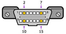 4. Осмотреть диагностический разъем и определить наличие выводов в нем (как правило, присутствует только часть задействованных выводов, а каждый протокол использует свои выводы разъема).