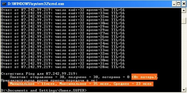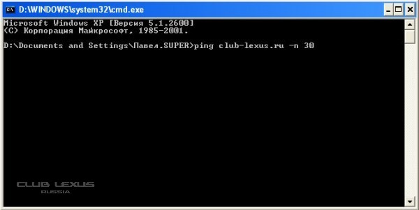 С следующем окне наберите: ping club-lexus.ru -n 30 и нажмите Enter.