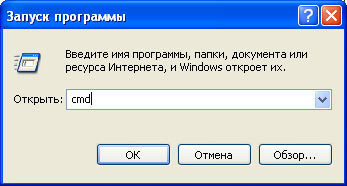В появившемся окне наберите cmd, затем нажмите "ОК".