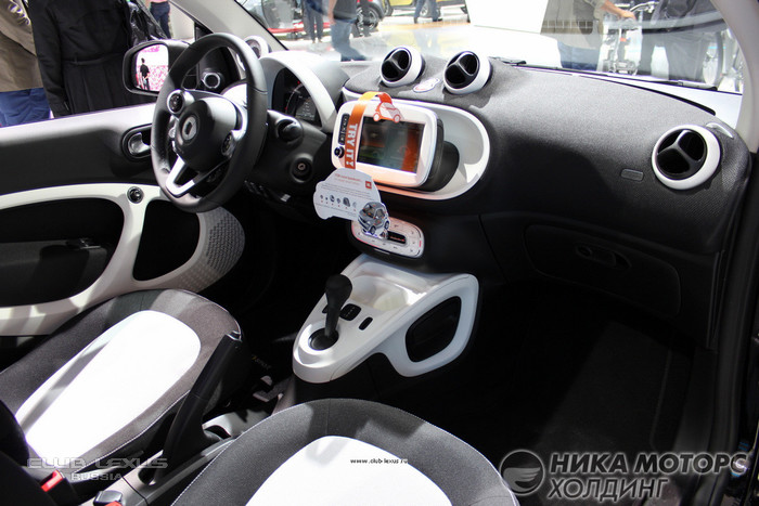 За новым экстерьером последовал и новый интерьер. Двухместный smart fortwo щеголяет обилием овальных, сферических и круглых элементов оформления, может комплектоваться тканевой обивкой верхней части передней панели, получил модернизированную панель приборов и вынесенный на подставке дисплей бортовой мультимедийной системы.